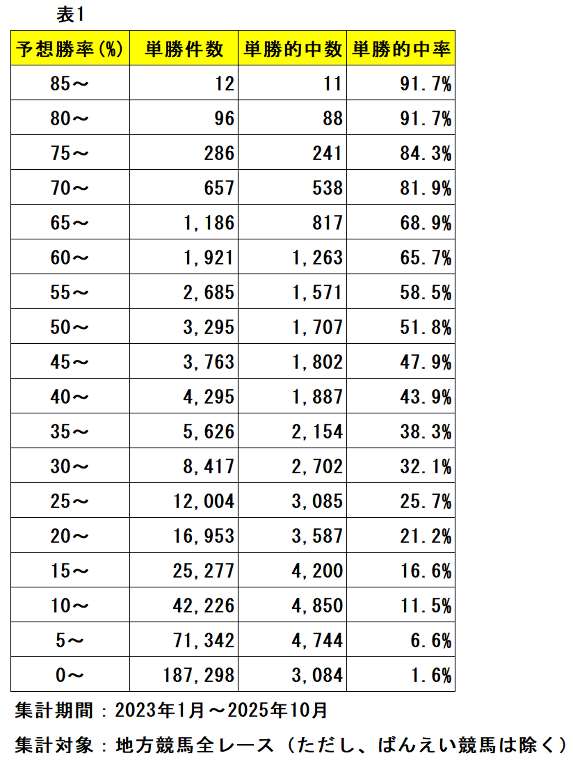 表1は、AIが予測した2023年以降に出走した各馬の「予想勝率」を5%刻みで区分したものです。